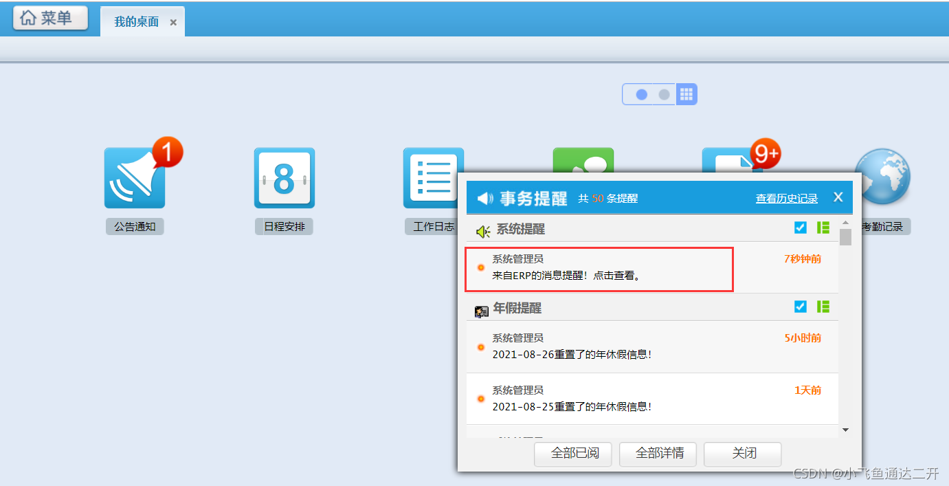 网页端和精灵段都可以收到提醒的消息,默认都是从系统管理员发出的,当然也可以根据需要来指定消息发起人。这里对于通达OA不同版本的消息支持是有一些差异的,需要根据版本做些调整。