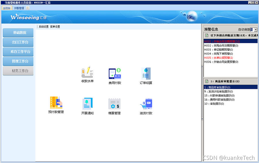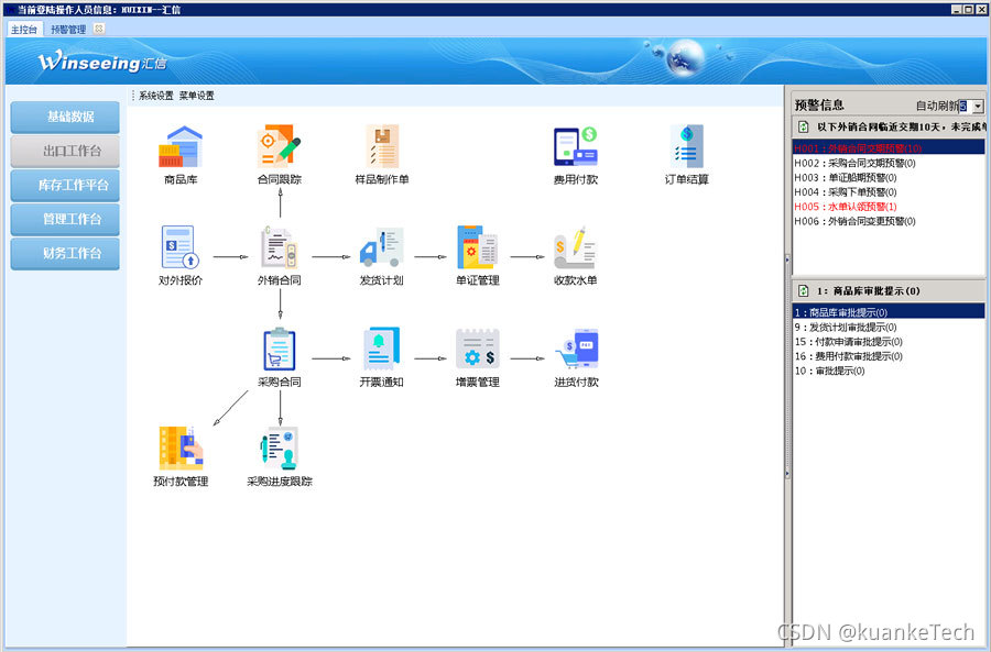 【预警管理】软件登录后,第一个界面为工作预警界面。预警的内容可以是通用模式的,也可以按照客户要求进行个性化设定。主要展示的内容有:交期提醒,收款提醒等等,防止业务员疏忽造成延期。