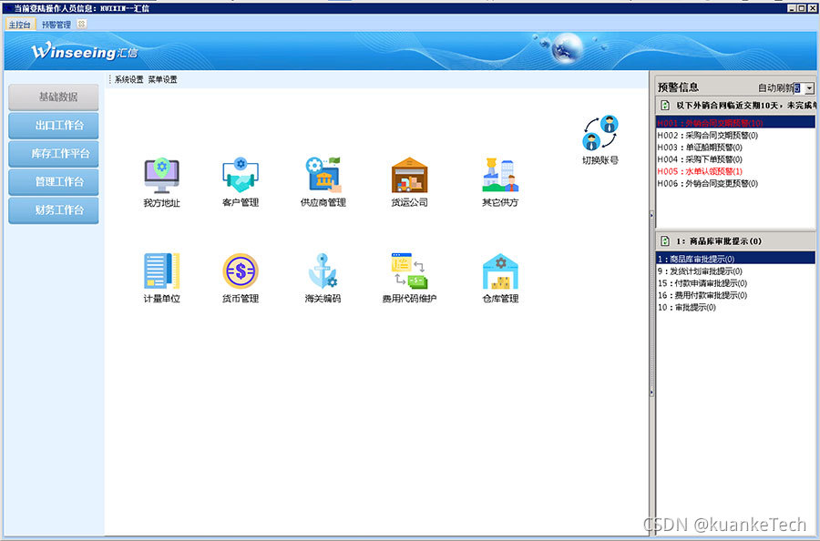 外贸出口管理软件,主要包含的功能模块分类主要有5部分:基本数据、业务工作台、财务工作台、历史价格查询、和领导平台。作为ERP来讲,大家知道,首先是要有基础数据,主要是为了数据只录入一遍可以全程调用,减少重复劳动,提高工作效率,减少出错率。下面我们来看一下基本数据和主要的业务流程。