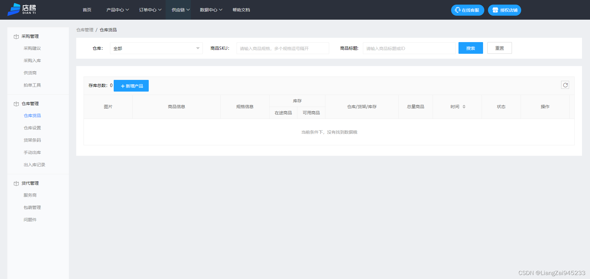 首先看到仓库货品处,这里可以选择仓库和输入商品SKU或商品标题来搜索商品库存,也可以新增产品;点击新增产品,可以通过不同渠道添加商品,添加后的商品会在列表显示出来,商家可以进行更新或删除操作;