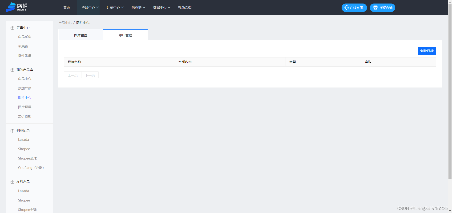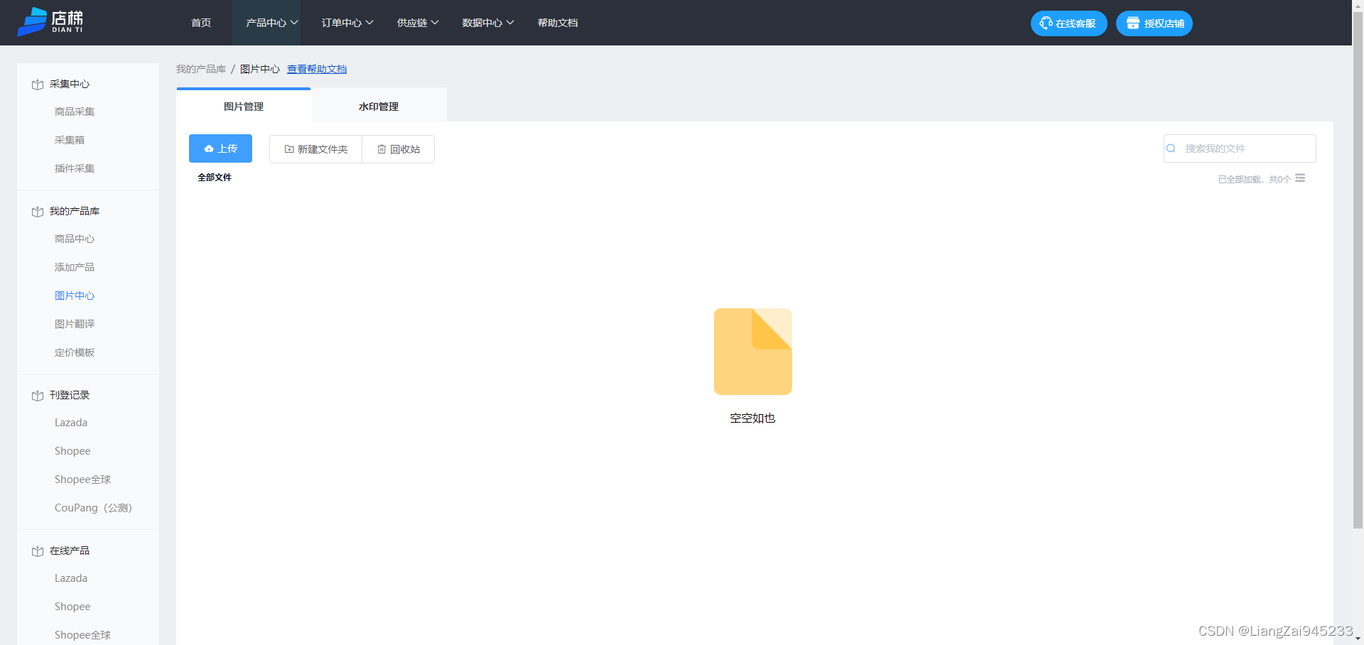 进入店梯erp,点击产品中心,看到我的产品库模块,子模块中的图片中心模块,图片中心分为图片管理和水印管理,这里分开来看;
