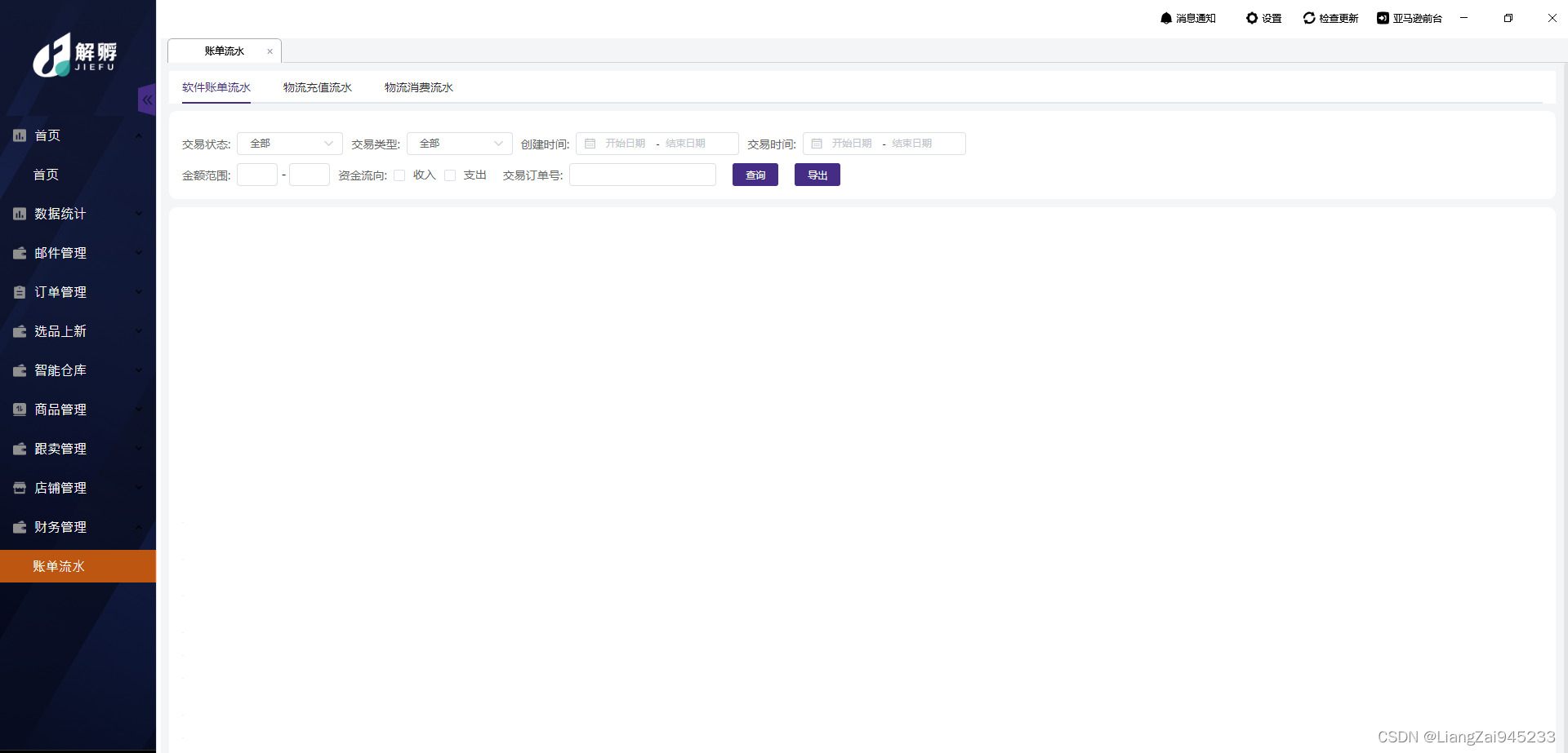 打开解孵,可以看到这左侧导航栏底部便是财务管理模块,这个模块下是账单流水模块,其次有三个子模块,分别是:软件账单流水,物流充值流水和物流消费流水;