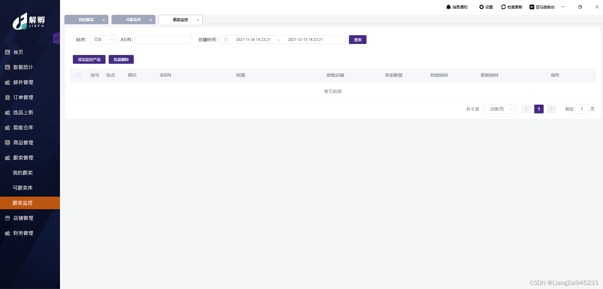 打开解孵首页左侧导航栏的跟卖管理模块,有我的跟卖、可跟卖库、跟卖监控三个子模块;我的跟卖可搜索添加跟卖产品,对跟卖的产品进行操作;可跟卖库会显示可以跟卖的商品,点击批量添加跟卖可以跟卖产品;跟卖监控可以添加监控产品,对产品进行实时把控,也可操作批量删除产品;