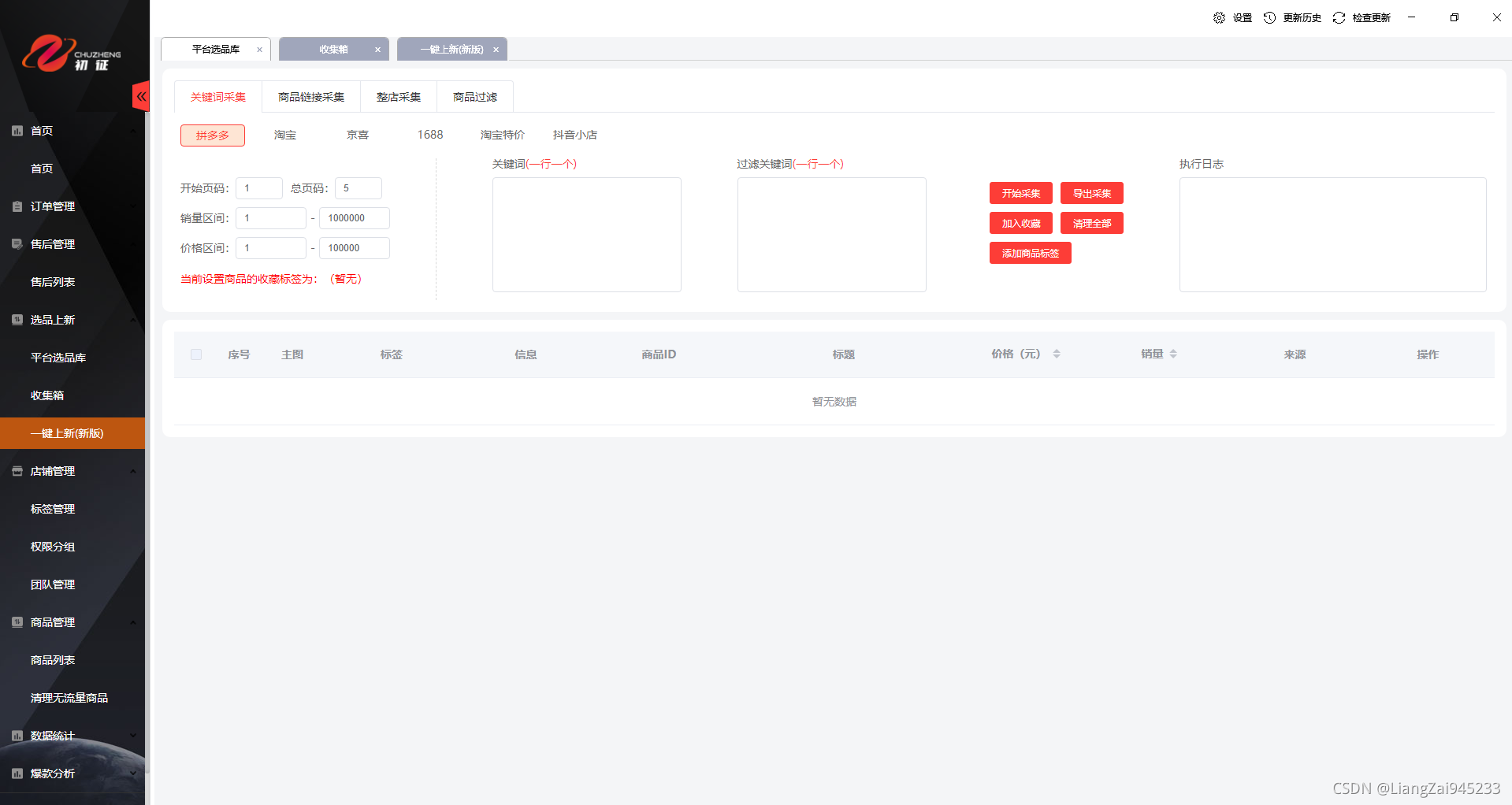 初征的选品上新功能也是比较强大全面的,可采集各平台商品,比如用关键词采集,可以选好平台后,输入关键词,点击开始采集,执行日志会显示采集完成,下方数据会出现采集到的商品,勾选需要的商品,点击加入收藏,并设置好标签即可;这时候采集到的商品会自动加入收集箱,在收集箱内,可以对商品进行编辑处理,然后确定好需要上新的商品,点击一键上新;跳转到一键上新后,勾选确认店铺,勾选好需要上新的商品,在上方的模块中可以设置需要的参数,发布商品即可;