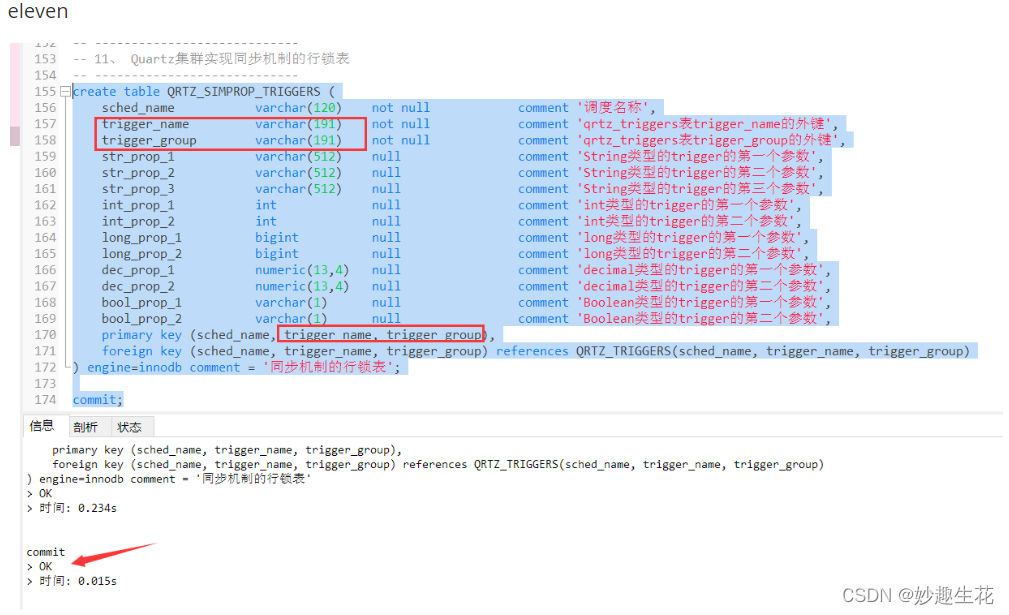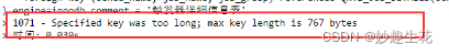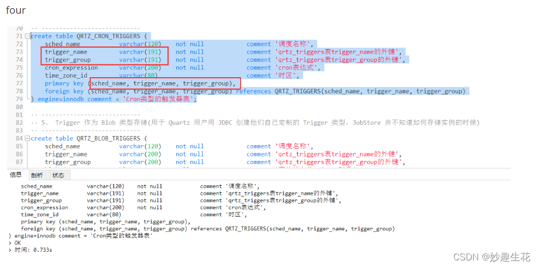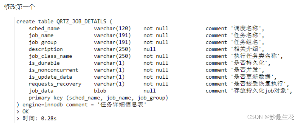 简单来说就是 主键varchar类型 长度太长了 如果是自己建表的话 你可以试一下varchar作为主键长度设置200 保存表看看能不能创建成功 答案是不能 因为varchar尝试之后作为主键的时候最大值是191 虽然也不太明白这里的细节道道 但是找到了 这个问题 那就直接修改quarz.sql文件中各个表的主键长度啦