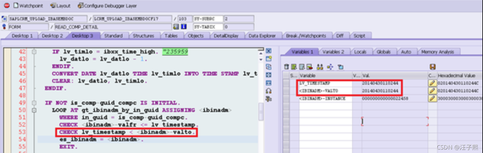 这一回,在调试器里,所有的谜题都揭晓了:当前时间戳 = IBASE valto 字段值,因此导致 API CRM_IBASE_COMP_GET_DETAIL 读取失败,抛出运行时错误。