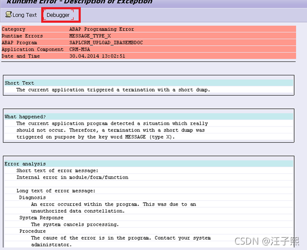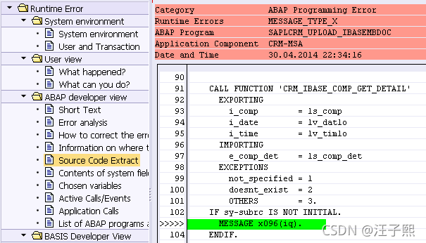 回到故障提交报告里的运行时错误截图:第 103 行抛出了一个类型为 X 的错误,因为调用函数 CRM_IBASE_COMP_GET_DETAIL, 并没有读取到通过输入参数 i_date 和 i_time 指定的时间戳对应的 IBASE 数据,因此程序决定通过抛出错误的方式来终止执行。