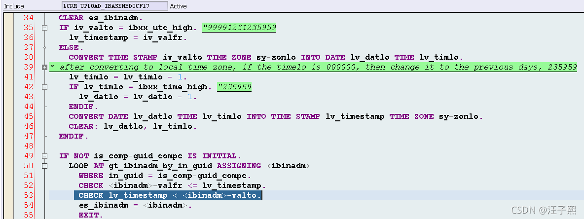 通过运行时错误的上下文调用栈,我找到了 CRM_IBASE_COMP_GET_DETAIL API 没有返回任何 IBASE 数据的原因:下图第 53 行高亮代码的 CHECK 语句,检查当前传入的时间戳(默认为 IBASE 创建时的时间戳)是否小于待读取 IBASE 抬头的 valto(即 valid to,指 IBASE 有效截止日期的时间戳)字段。如果小于,则顺序执行 CHECK 下一条即 54 行。如果大于或等于,则退出数据读取逻辑所在的循环体。