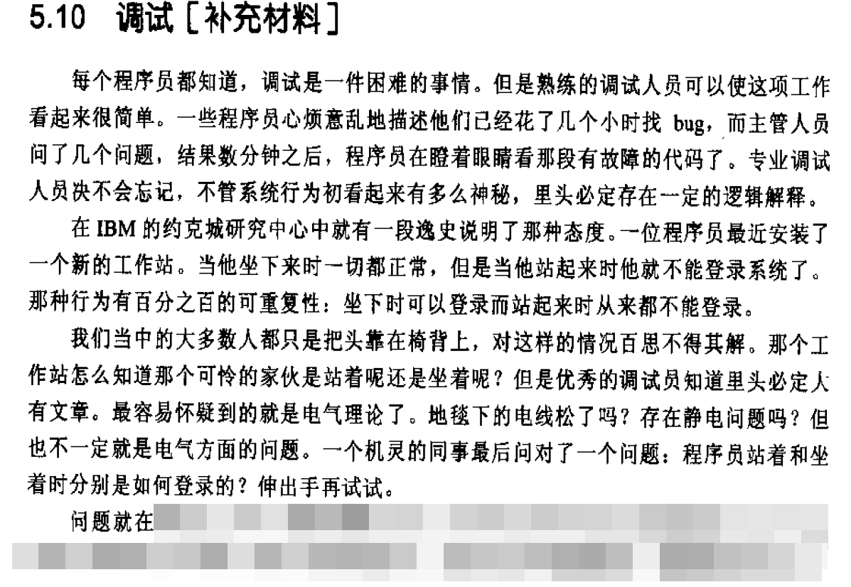 《编程珠玑》第五章曾经分享过一个关于故障调试的有趣故事:IBM 研究中心一位程序员,新安装了一台工作站,发现一个故障:他只能采取坐着的姿势登录系统;一旦站起来,就无法登陆系统了。大家知道这个故障最后怎么定位的吗?去读读原书吧!