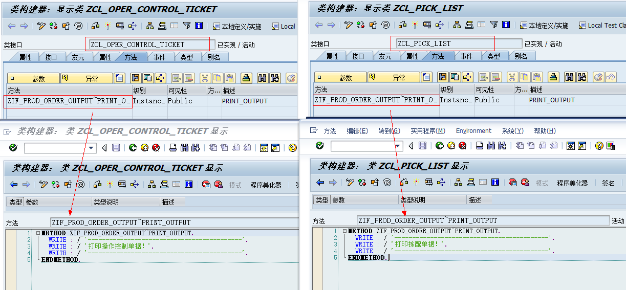 创建实现接口类“ZCL_PICK_LIST”和“ZCL_OPER_CONTROL_TICKET”,实现接口方法逻辑中输入打印控制的逻辑。