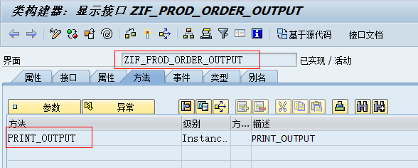 创建订单输出文档接口“ZIF_PROD_ORDER_OUTPUT”,并定义方法“PRINT_OUTPUT”。