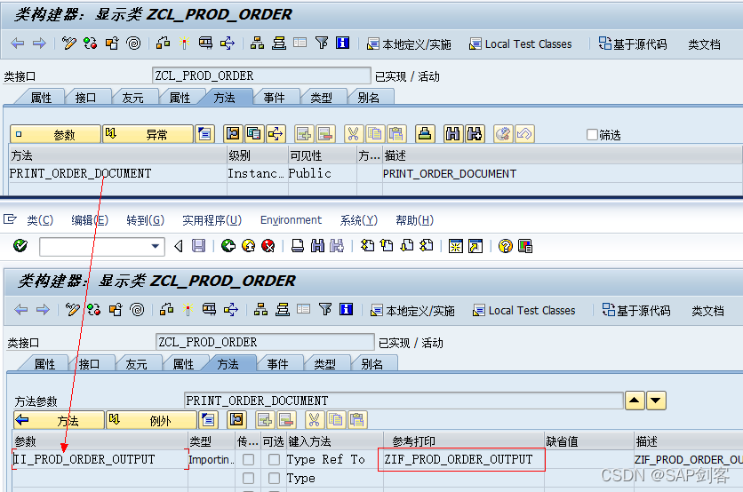 创建抽象类“ZCL_PROD_ORDER”,并定义方法“PRINT_ORDER_DOCUMENT”,设定传入参数“II_PROD_ORDER_OUTPUT”,其类型为接口“ZIF_PROD_ORDER_OUTPUT”,不需要设定具体的实现逻辑。