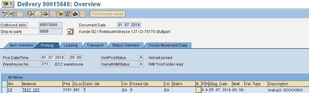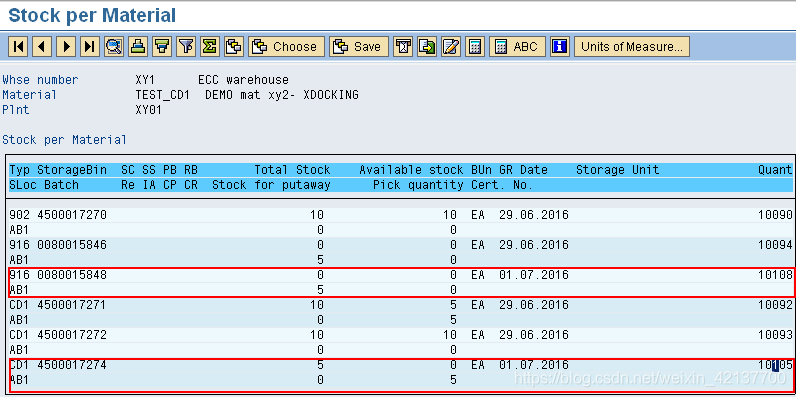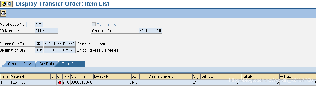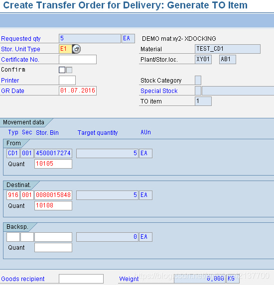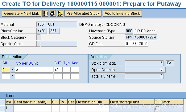 We can see that the destination storage type is automatically selected as 916 and the storage bin is our outbound delivery number from the GR area as CD1 with PO#4500017274 That means that the stock is directly moving from interim GR area to shipping area deliverables. Note : For the movement type 990 in our scenario , the source storage type configured is CD1 in SPRO. In general for 101 movement it is 902